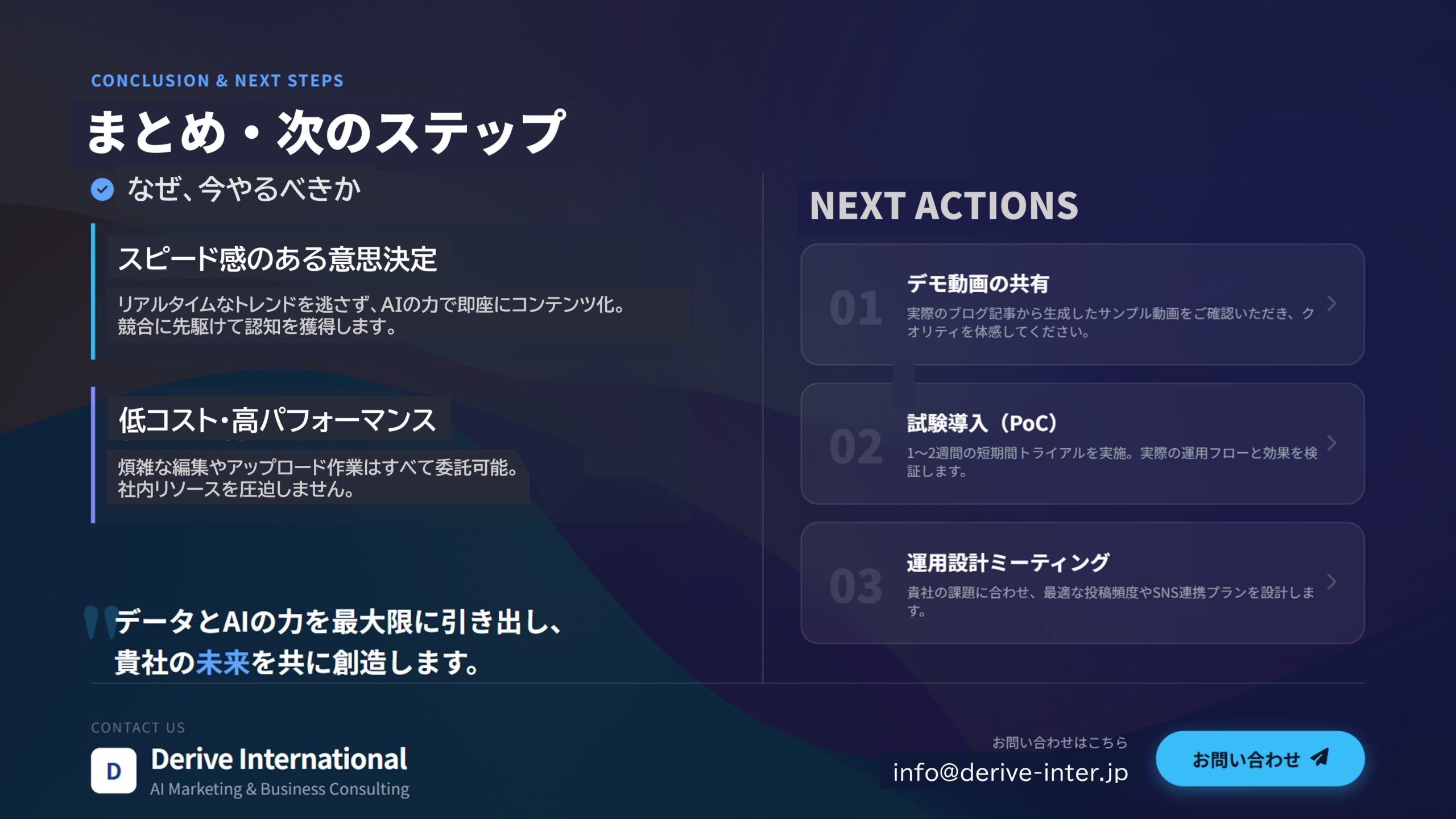 Derive Internationalは、データとAIの力を最大限に引き出し、 貴社の未来を共に創造します。